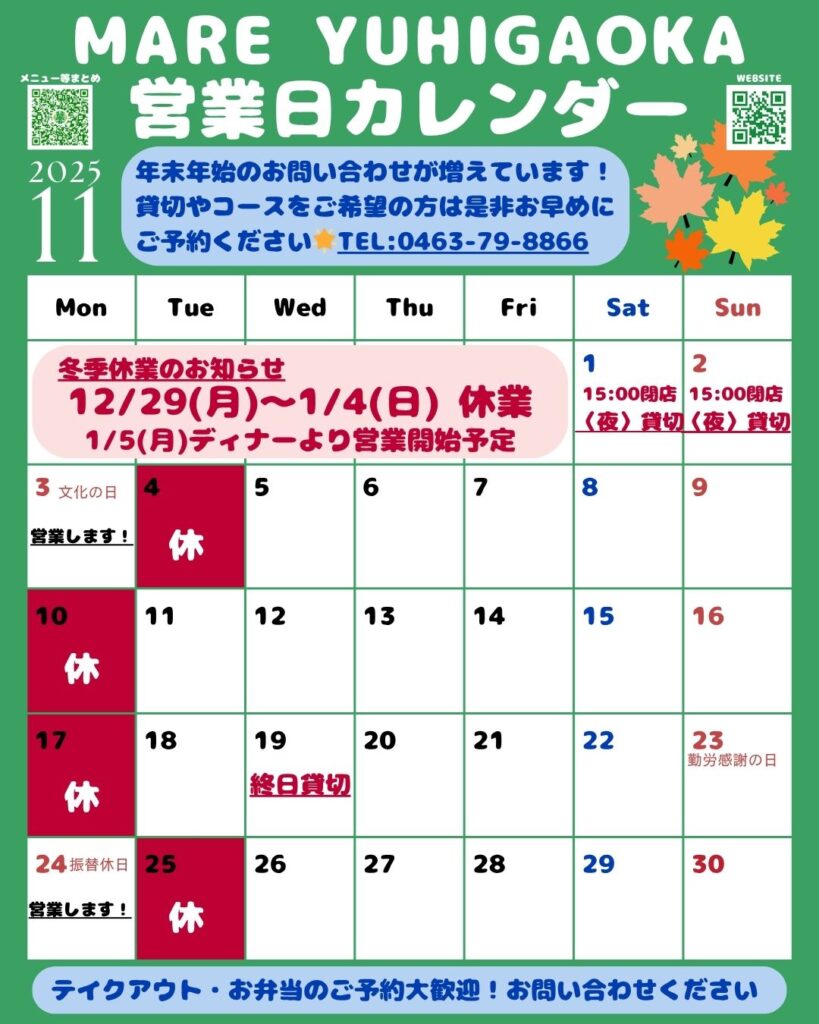 ★11月営業日カレンダー★
